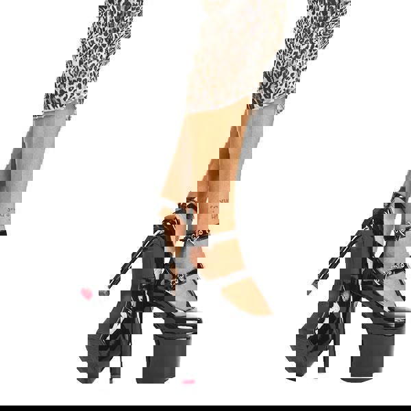 Show Your Fantasies Platform Heels in Black patent. These platform heels feature a minimalist look with a high heel, keeping it nice and classy. These heels also feature two adjustable straps with silver heart buckles and silver eyelets. Also features red heart detailing. Made with materials and 100% cruelty-free. 100% .