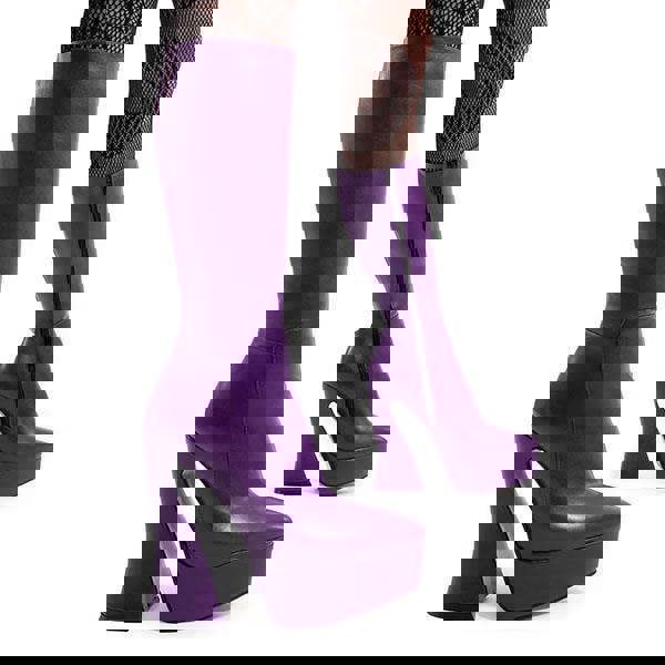 Constructed from premium vegan friendly purple PU, these boots are selected for their deep color saturation and resilient texture. The design focuses on a balanced silhouette, utilizing a wide block heel and a thick front platform to provide a statuesque height while maintaining a stable base. The calf high cut is engineered to hold its shape, providing a clean and professional look through regular use.