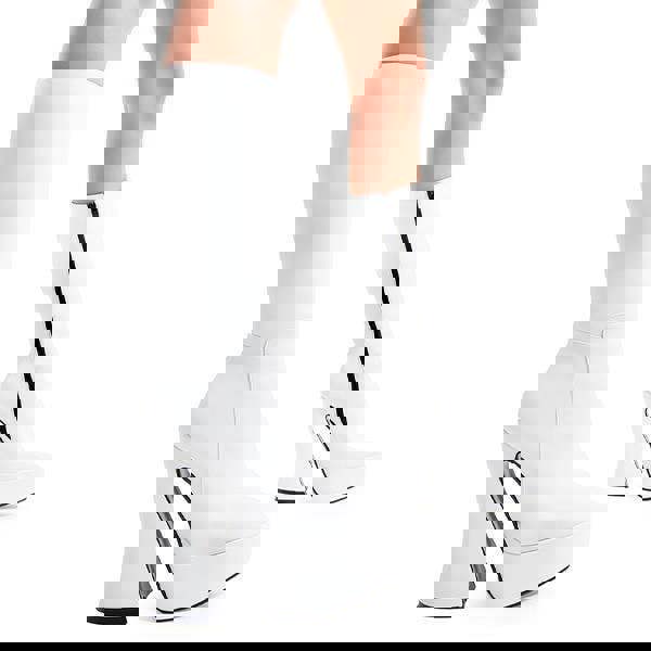 Constructed from premium vegan friendly white PU, these boots are selected for their clean color profile and resilient texture. The design focuses on a balanced silhouette, utilizing a wide block heel and a thick front platform to provide a statuesque height while maintaining a stable base. The calf high cut is engineered to hold its shape, providing a clean and professional look through regular use.