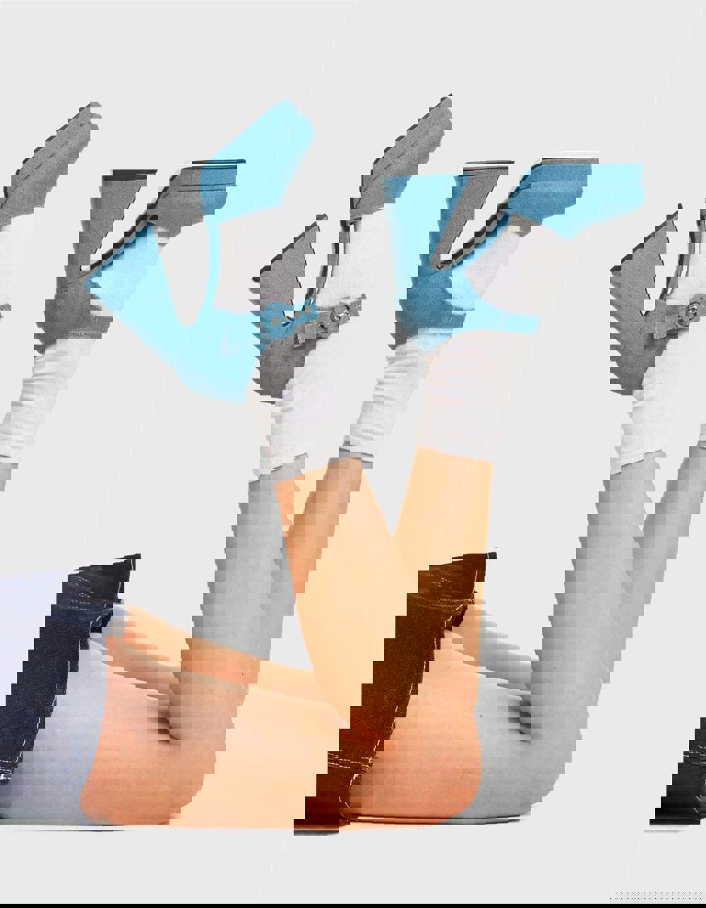 Constructed from high-quality denim fabric, these heels are engineered for a soft yet structured fit. The material choice provides a distinct tactile contrast to the brand's classic PU models while maintaining the same structural integrity. The design focuses on a balanced distribution of weight, utilizing a robust block heel and a thick front platform to ensure stability. The adjustable ankle strap with a silver buckle provides a secure, customized fit for all-day or all-night wear.