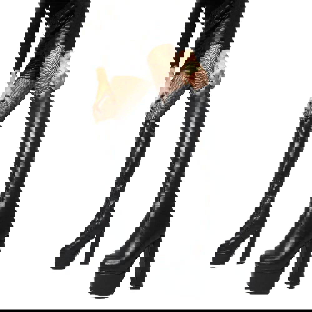 These high impact boots feature a massive block heel and a robust platform sole that provides incredible height while maintaining a sturdy and confident stride. The streamlined knee high silhouette and rounded toe design offer a flattering elongated look that pairs perfectly with mini skirts, oversized hoodies, or layered grunge styles. Whether you are hitting the stage or the streets, these boots deliver the ultimate combination of bold attitude and iconic platform style.