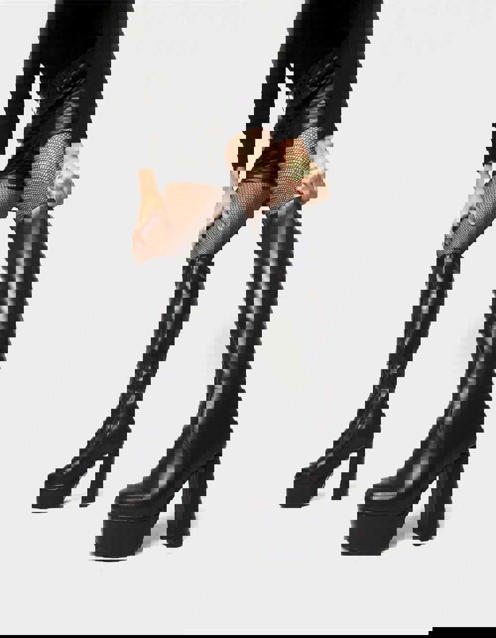 Whatta Showdown Platform Knee High Boots in Black faux leather. These Black vegan Boots feature an elegant minimalist design and a Platform sole and heel, perfect for adding height and style to any outfit. Made with eco-friendly materials and 100% cruelty-free, these boots are as ethical as they are stylish.
