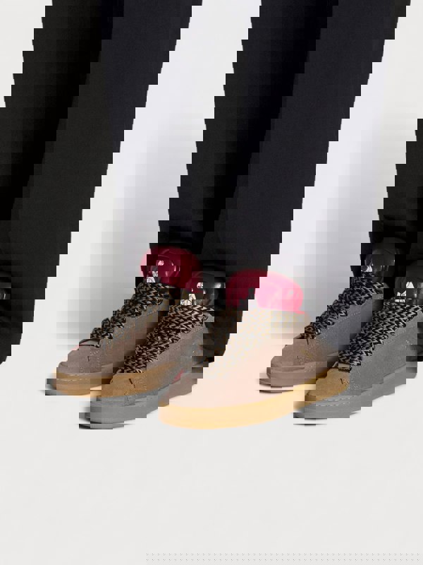 These Lanvin X Future Hyper Curb Sneakers blend premium brown leather and suede for a sophisticated yet contemporary look. Expertly crafted, they offer refined comfort and distinctive style, making them a versatile addition to any wardrobe. Perfect for those who appreciate luxury design with a modern edge.