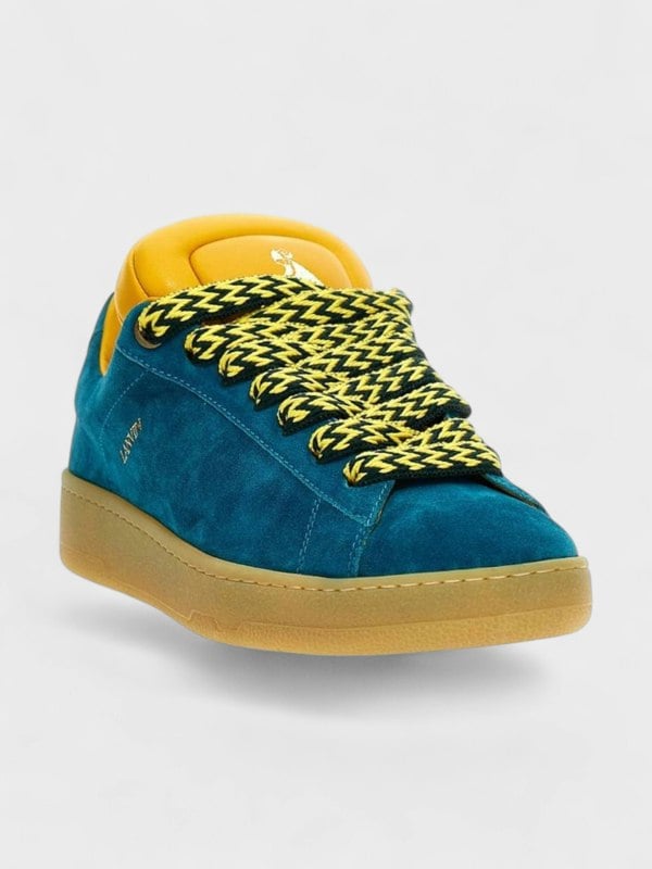 These Lanvin x Future Hyper Curb Sneakers in blue combine luxury suede craftsmanship with a bold, contemporary design. The rich blue suede adds a refined yet edgy touch, while their sculpted sole offers distinctive style and comfort. Perfect for those who want to elevate their sneaker game with a unique, artful statement piece.