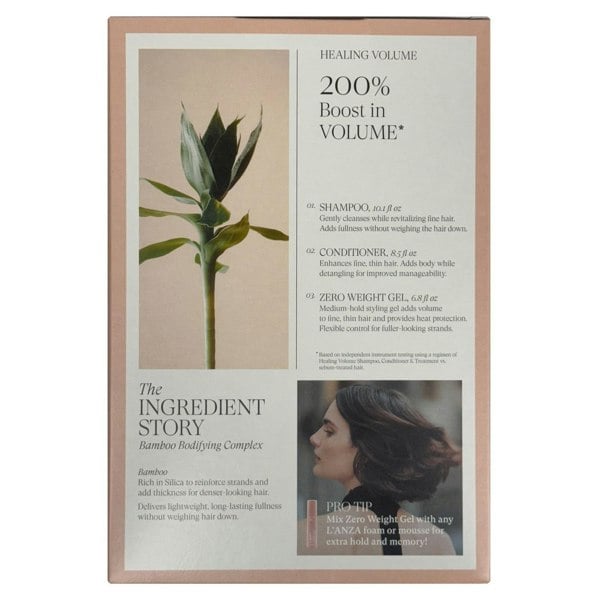 L'Anza Healing Volume Gift Set containing a L'Anza Healing Volume Thickening Shampoo 300ml, a L'Anza Healing Volume Thickening Conditioner 200ml and a L'Anza Healing Volume Zero Weight Gel 200ml.
