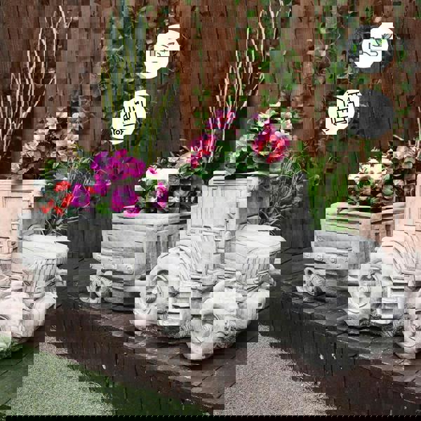 Showcase flowers & plants and create sensational seasonal displays with this attractively detailed garden flower pot of a Tractor with a trailer. A most distinctive addition to your garden! Both the tractor and trailer have areas for planting making this the perfect patio display. Beautifully detailed and altogether weighing over 70kg these are a solid and heavy piece.