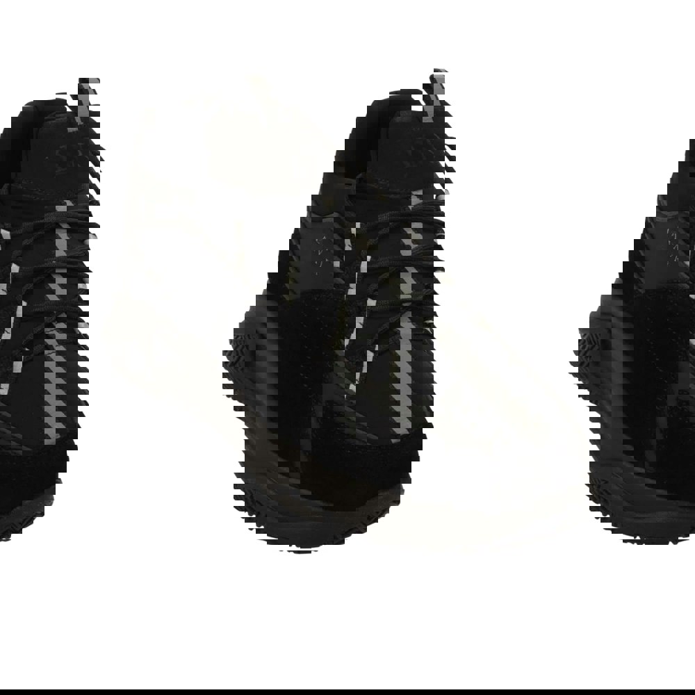 Finished with a round toe and flat profile, the pair fastens with classic lace-up styling. A pull tab supports easy on and off, while reflective detailing adds a subtle accent to the black design.
