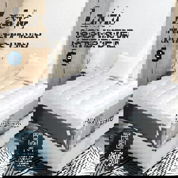 Upgrade your sleep comfort with Lavio single mattress topper designed for ultimate support and softness. Crafted with 1000GSM microfibre filling and a quilted design this topper offers a plush 10cm thick layer that provides pressure relief and long-lasting comfort. The hypoallergenic fabric helps protect against dust mites and allergens making it ideal for sensitive sleepers. Equipped with anti-slip corner straps it stays firmly in place throughout the night. The removable and machine washable cover ensures easy cleaning and hygiene keeping your bed fresh every night.
