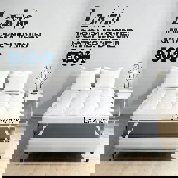 Transform your double bed into a luxurious sleep haven with the Lavio double mattress topper. Designed for ultimate comfort and support it features a 1000GSM microfibre filling and quilted design providing a plush 10cm thick cushioning layer that relieves pressure and enhances overall sleep quality. The hypoallergenic fabric helps protect against dust mites and allergens perfect for sensitive sleepers. Equipped with anti-slip corner straps it stays securely in place while the removable machine washable cover ensures easy cleaning and lasting freshness.
