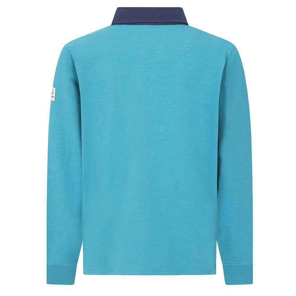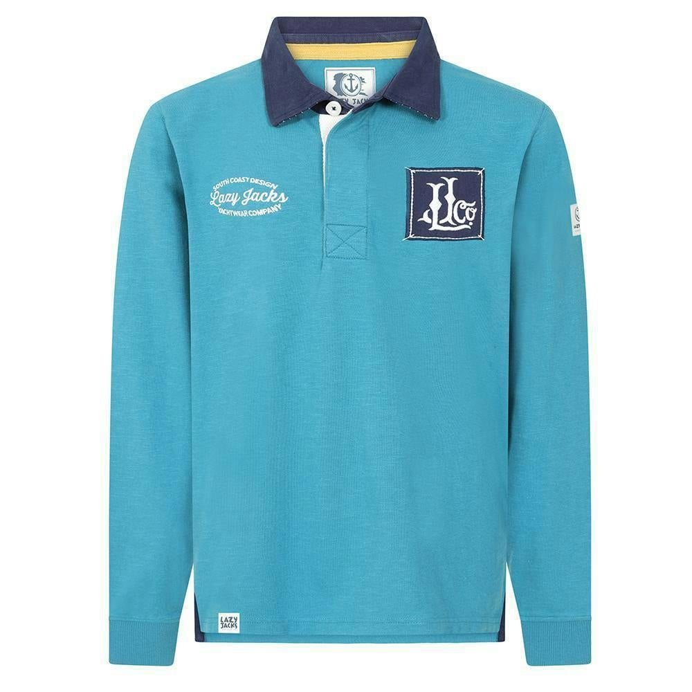 Lazy Jacks boys contrast collar rugby shirt in teal, made from 100% cotton with a pre-washed fabric finish. The design combines a plain body with a logo detail and a turn down collar in a contrasting colour. Long sleeves and fitted cuffs give a neat outline, while the front fastens with buttons for a classic rugby-shirt look.