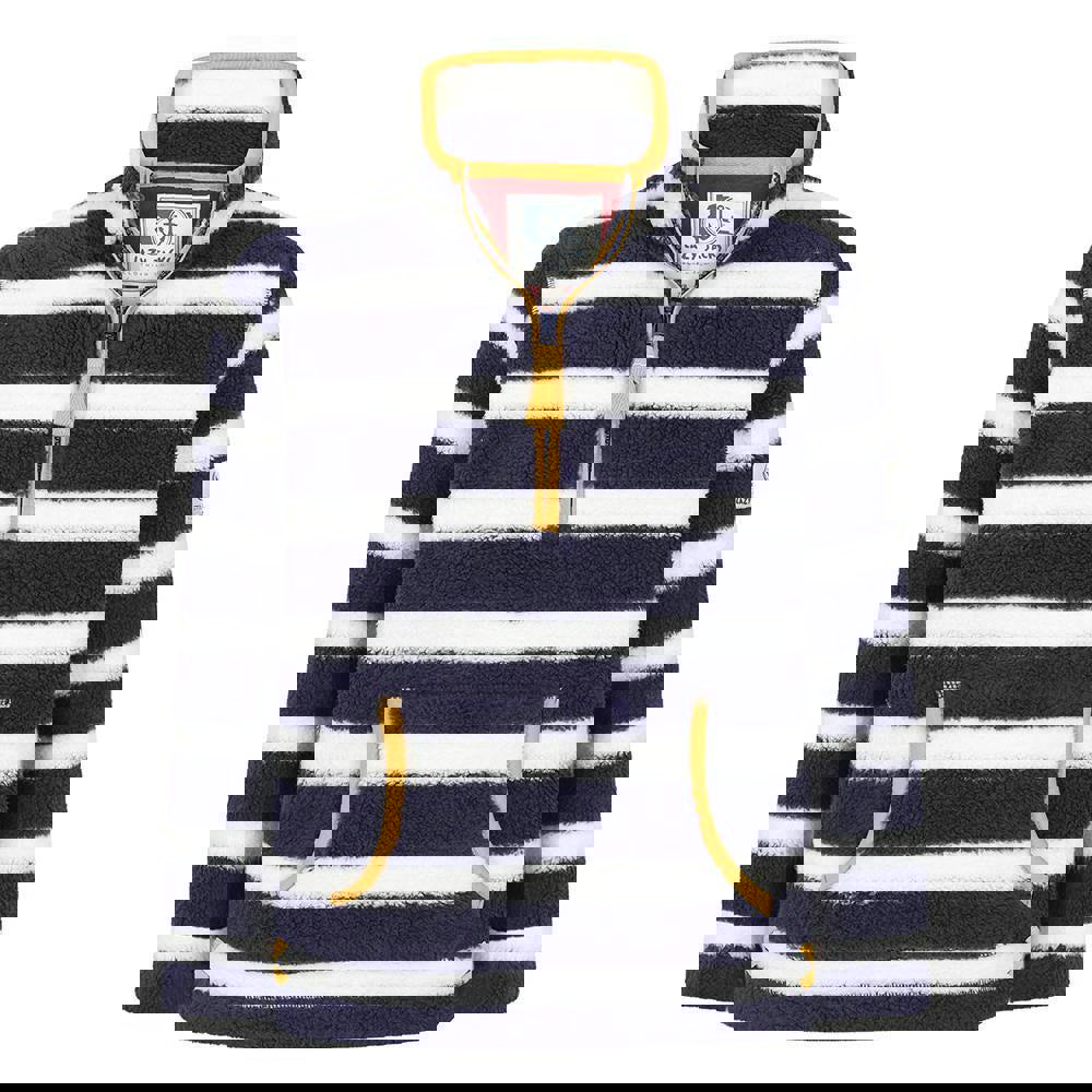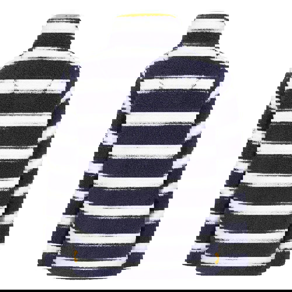 Lazy Jacks boys quarter zip sweatshirt in Marine, made from 100% polyester with a pre-washed fabric finish. The striped design is paired with long sleeves and a standing collar for a clean, structured look. It pulls on easily and secures at the neck with a quarter zip fastening. A single kangaroo pocket completes the front.