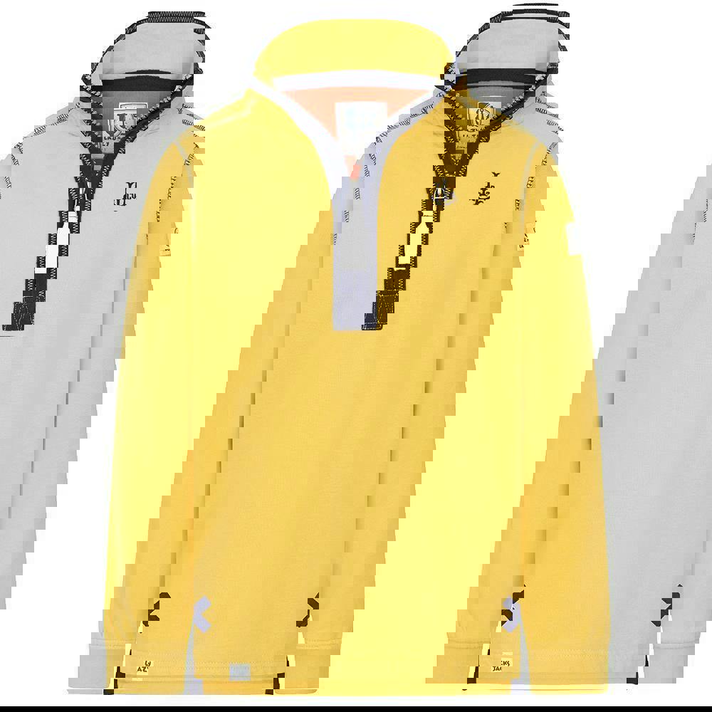 It has long sleeves and a standing collar, with a quarter zip and pull-over style fastening.