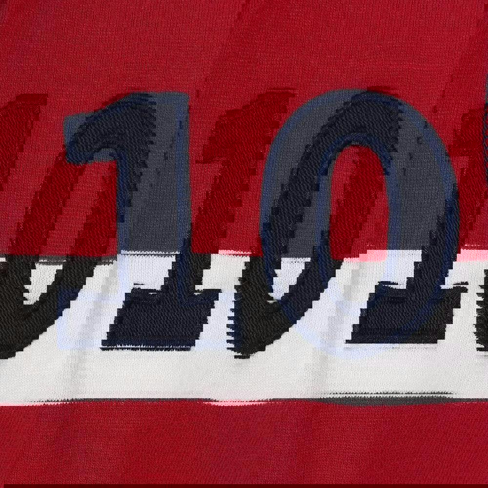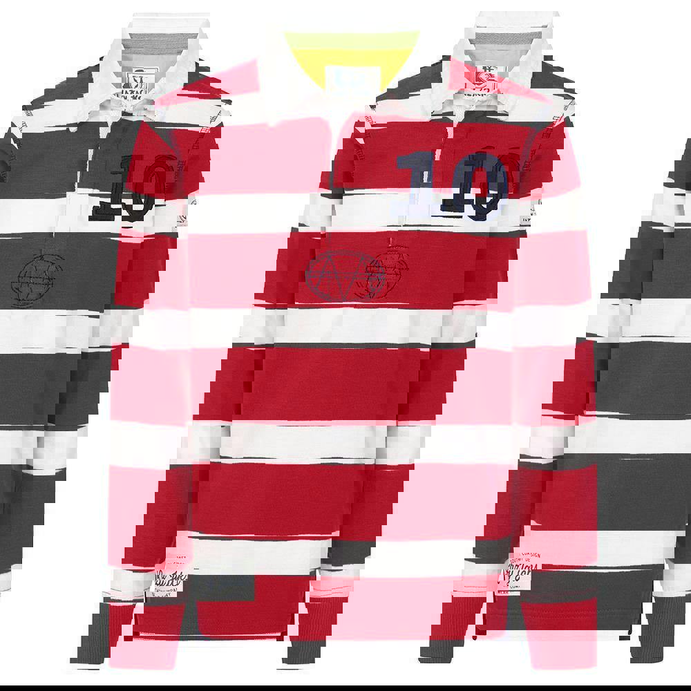 Lazy Jacks boys striped rugby shirt in crimson with a logo and striped design. Made from 100% cotton with a pre-washed, soft-touch finish, it has a turn down collar and long sleeves for a classic rugby look. A button fastening and fitted cuffs complete the clean, structured shape.