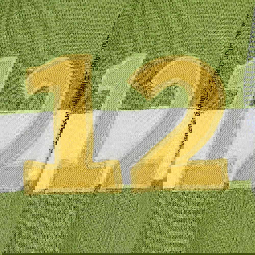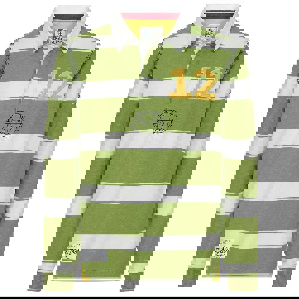 Lazy Jacks boys striped rugby shirt in lime, made from 100% cotton with a pre-washed, soft-touch finish. The design combines stripes with a logo detail and a turn down collar for a classic rugby look. Long sleeves and fitted cuffs create a neat outline, while the button fastening completes the front.