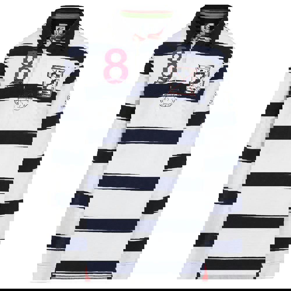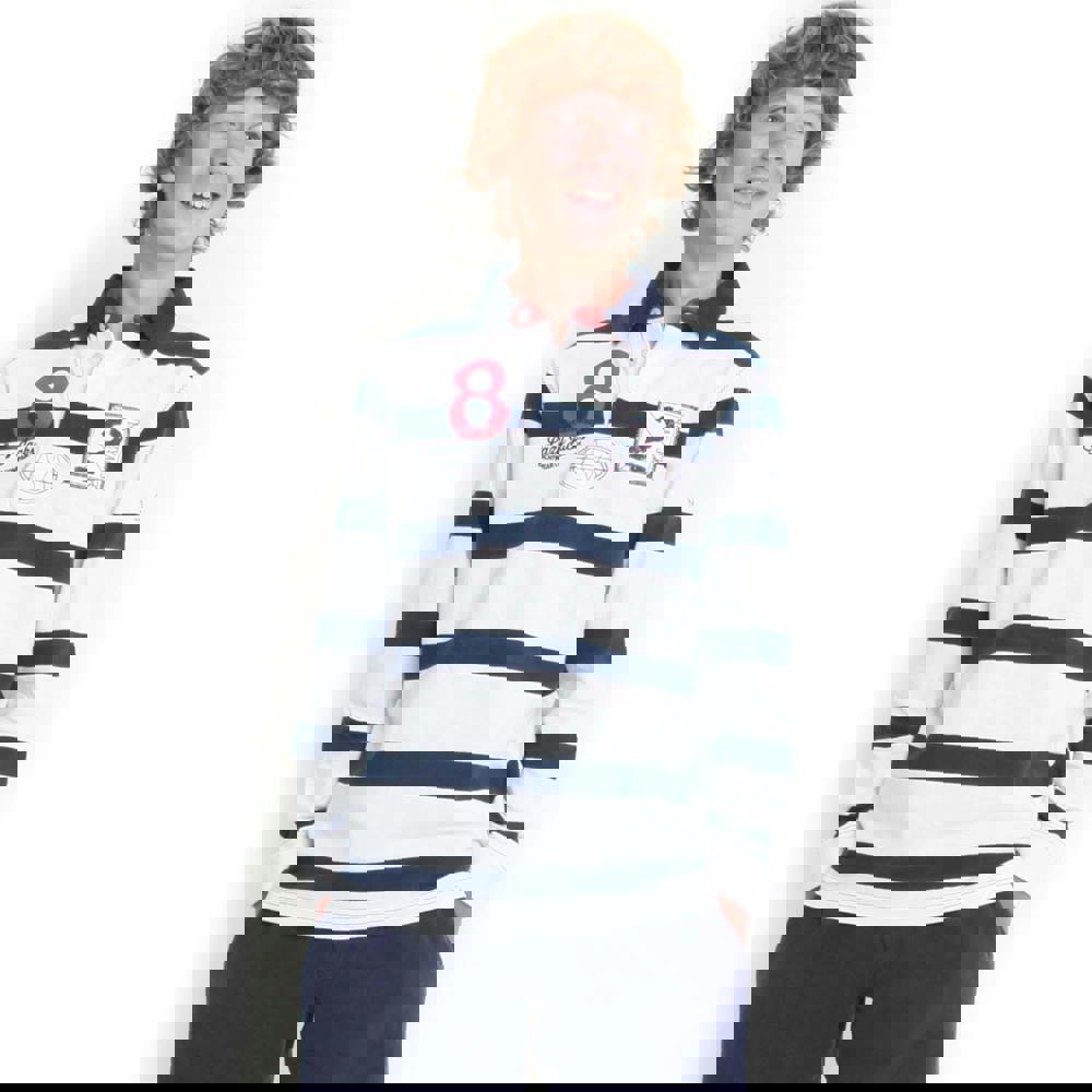 Lazy Jacks boys striped rugby shirt in white, made from 100% cotton with a pre-washed, soft-touch finish. The design combines stripes with a logo detail, finished with a turn down collar and a button fastening at the neckline. Long sleeves and fitted cuffs complete the classic rugby-shirt shape.