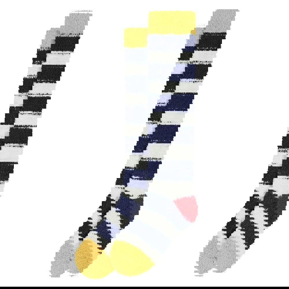 These children’s knee high socks from Lazy Jacks come in a marine colourway with a striped design. Made from a polyester and elastane blend, they have a fluffy, soft-touch fabric finish. Contrast detailing at the heel and toe adds a clear colour break against the striped body.