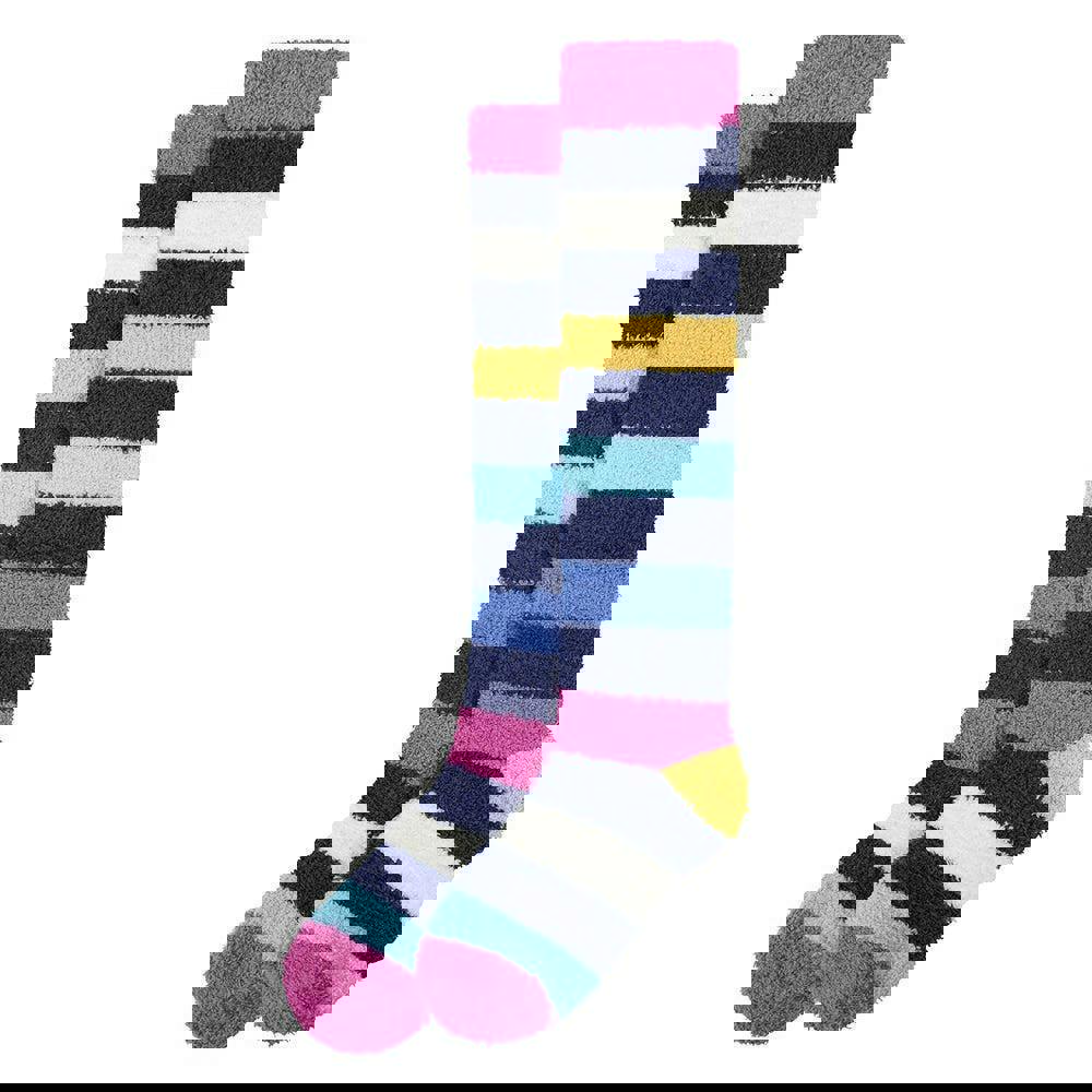 These children’s knee high socks from Lazy Jacks come in a Twilight multicoloured palette with a striped design. Made from a blend of 95% polyester and 5% elastane, they have a fluffy, soft-touch fabric finish. Contrast detailing at the heel and toe adds definition to the look while keeping the overall style bold and colourful.