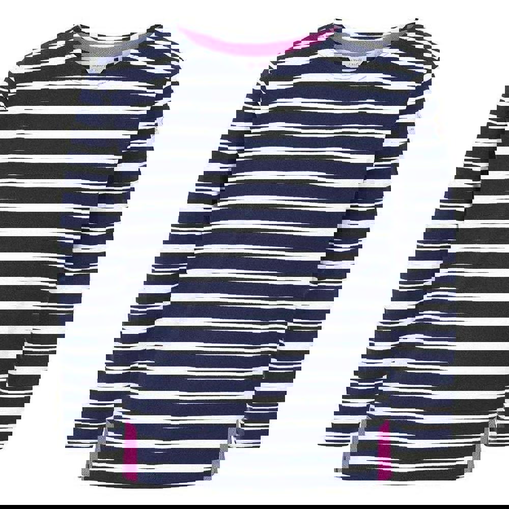Lazy Jacks Girls Breton Top in marine, made from 100% cotton. The fabric has a brushed, pre-washed, soft-touch finish. This long-sleeved top has a round neck and a mix of plain and striped sections, finished with a logo detail.