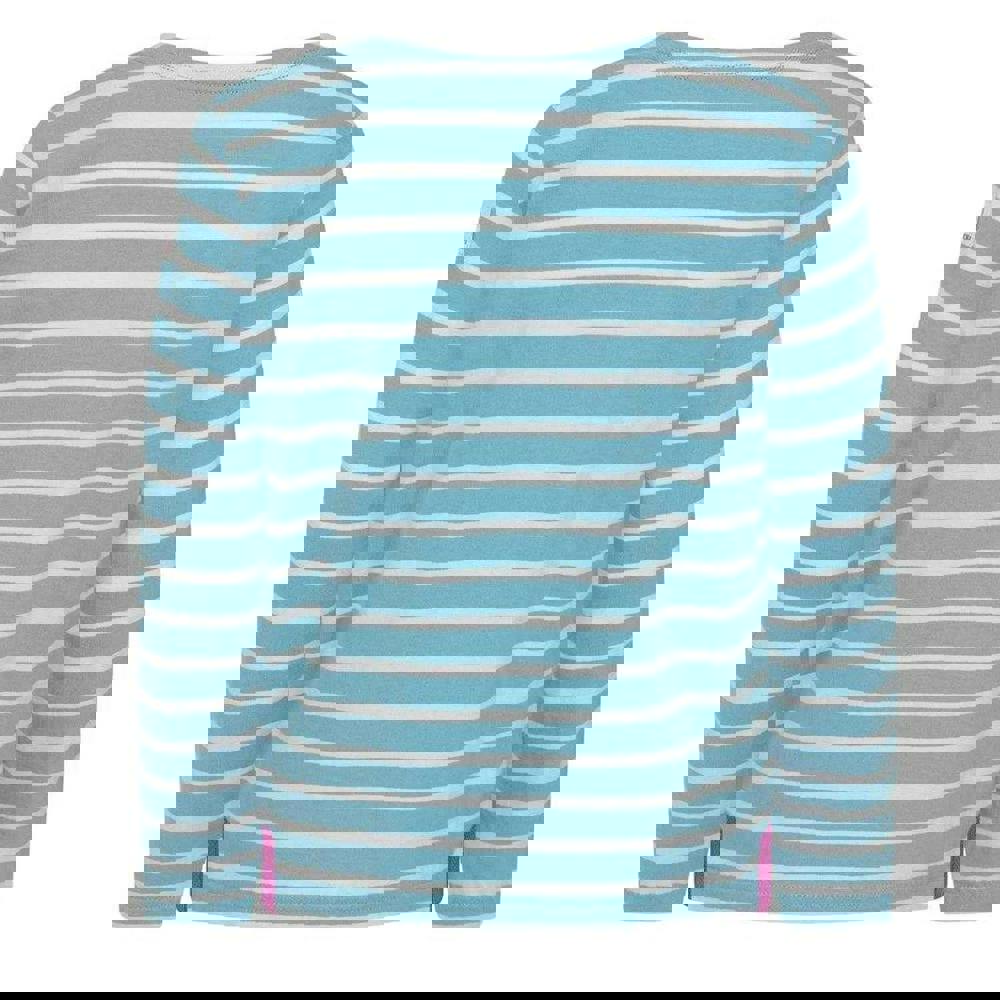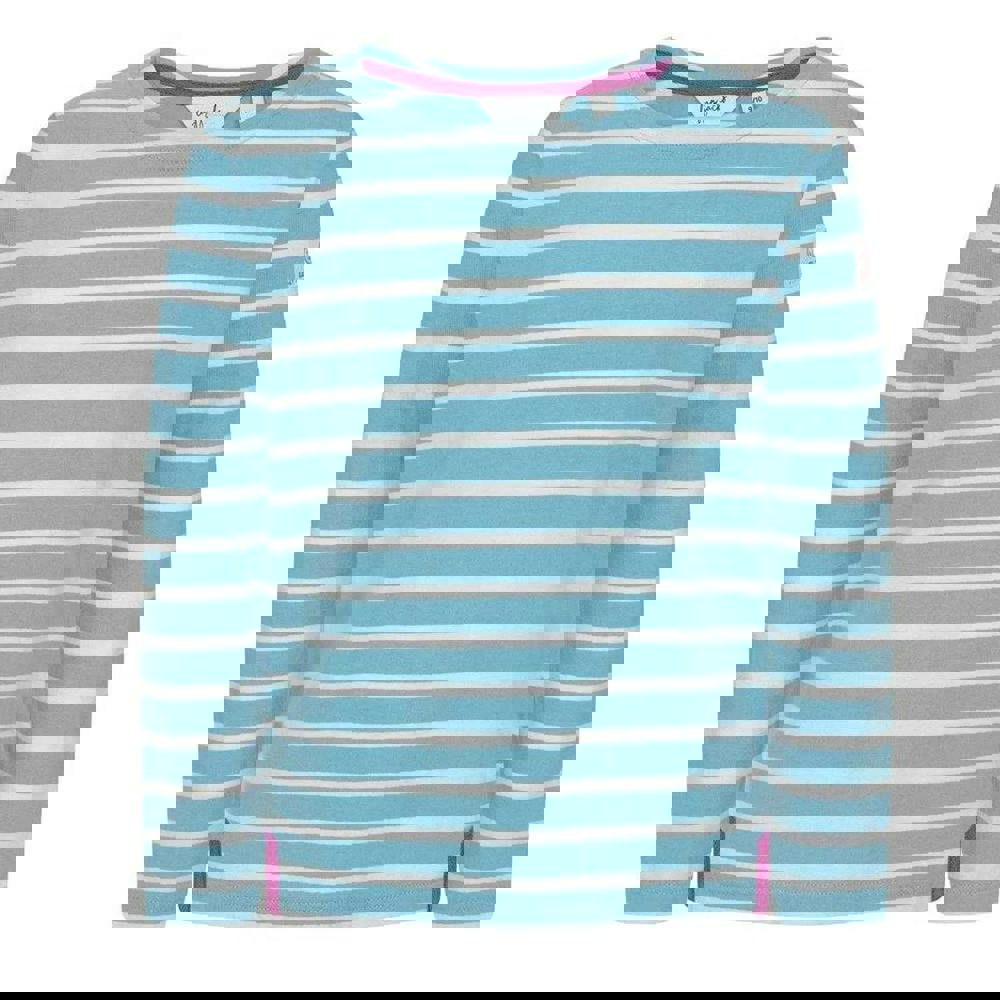 Lazy Jacks Girls Breton Top - Oceans Reef is made from 100% cotton with a brushed, pre-washed, soft-touch finish. The design combines plain and striped sections with a logo detail. It has long sleeves and a round neckline for a simple, classic shape.