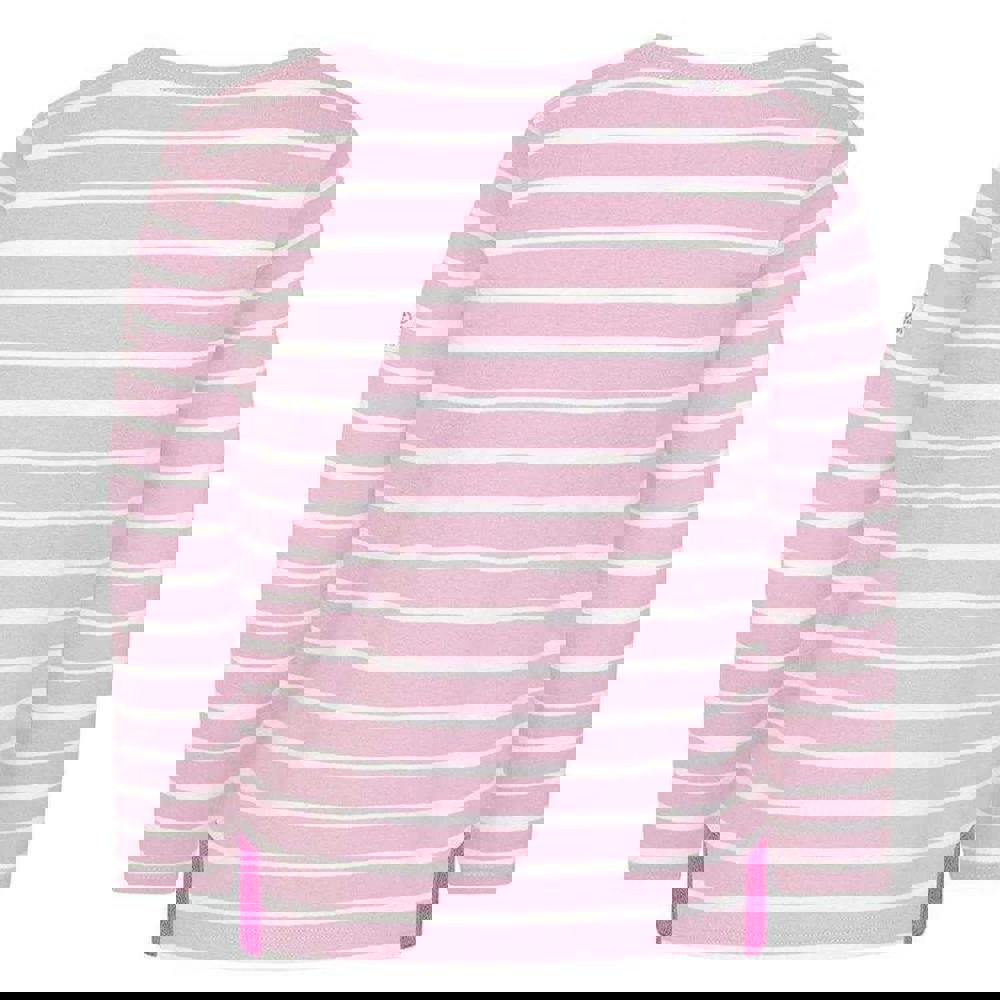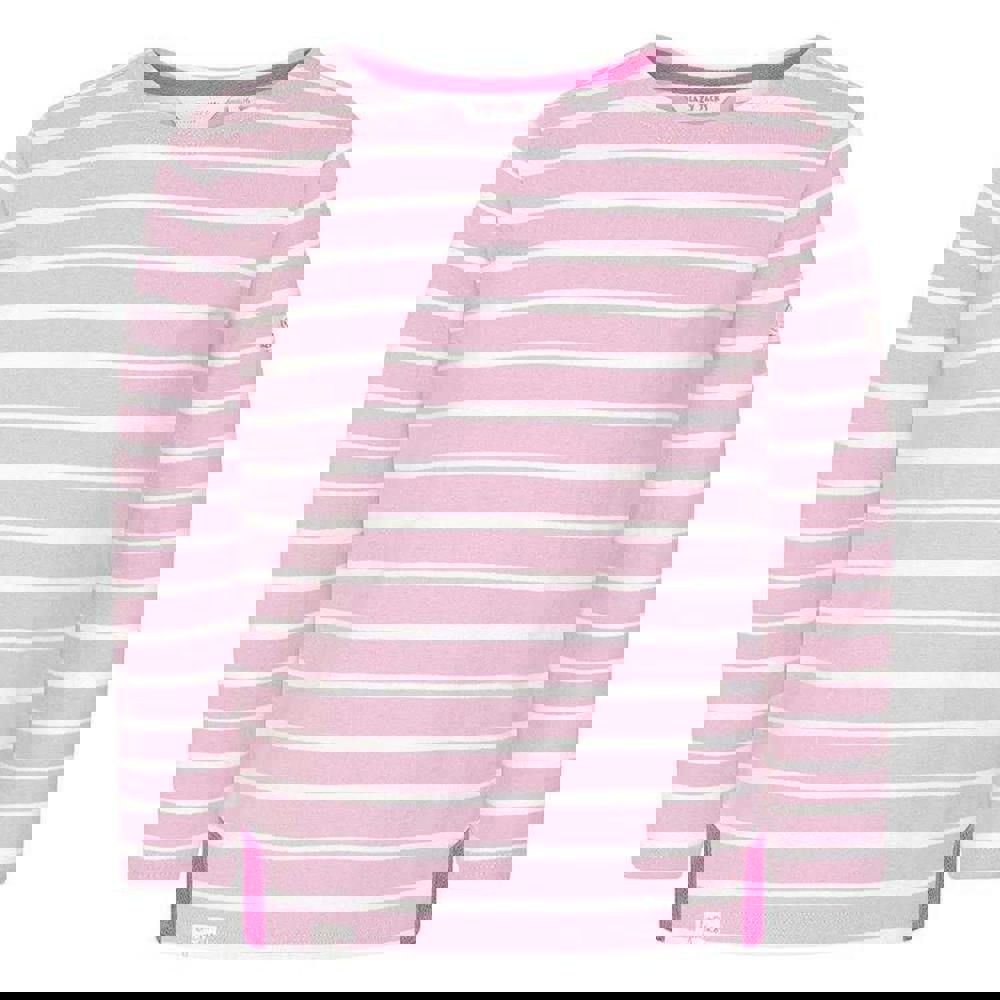 Lazy Jacks girls Breton top in pink, made from 100% cotton. The fabric has a brushed, pre-washed finish with a soft-touch feel. A classic round neckline and long sleeves keep the look clean and simple, while the Breton-inspired striped design is paired with plain sections and a logo detail.