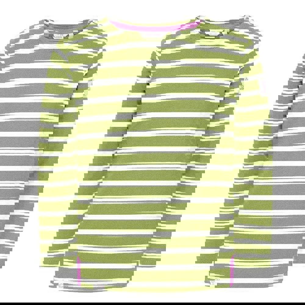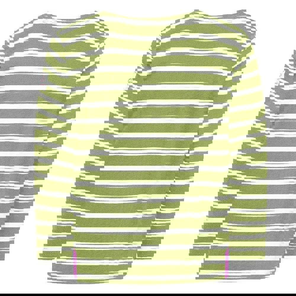 Lazy Jacks Girls Breton Top in sage, made from 100% cotton. The brushed, pre-washed fabric has a soft-touch finish. A classic Breton look combines a plain base with striped detailing, finished with a logo for a clean, simple style.