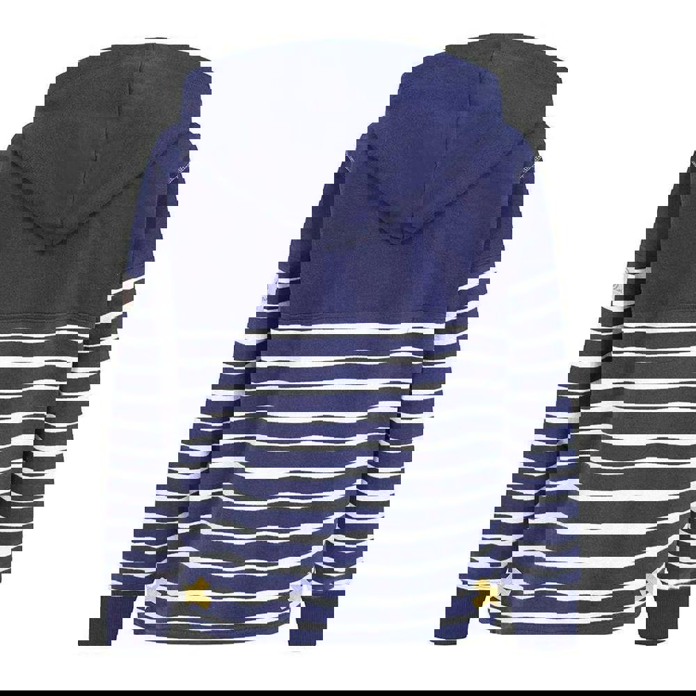 Lazy Jacks girls contrast striped hoodie in Prism Dusty Blue. Made from 100% cotton with a brushed, soft-touch fabric. The design combines a plain base with stripe detail and a logo. A hooded neckline and sew-on hood complete the look, while long sleeves with fitted cuffs and a fitted hem keep the shape neat.