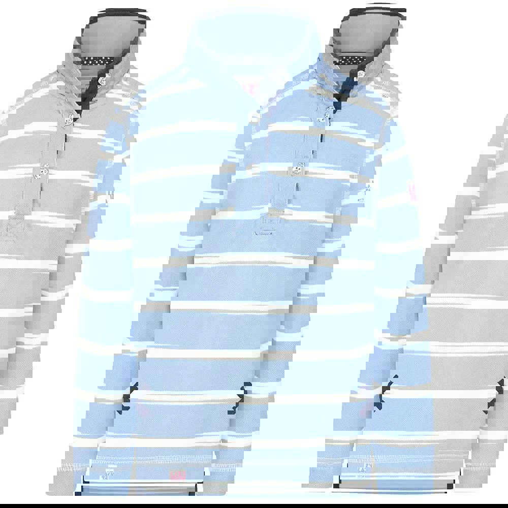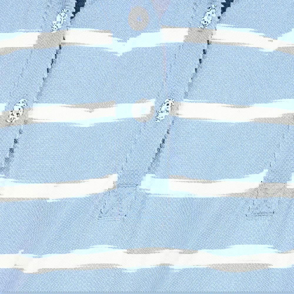 Lazy Jacks girls striped pique sweatshirt in sky, made from 100% cotton with a soft-touch finish. The pique fabric is paired with a printed stripe design, plus an embroidered logo and a branded patch for added detail. A standing collar and long sleeves create a neat, structured look, while the 3-button placket adds a classic finish.