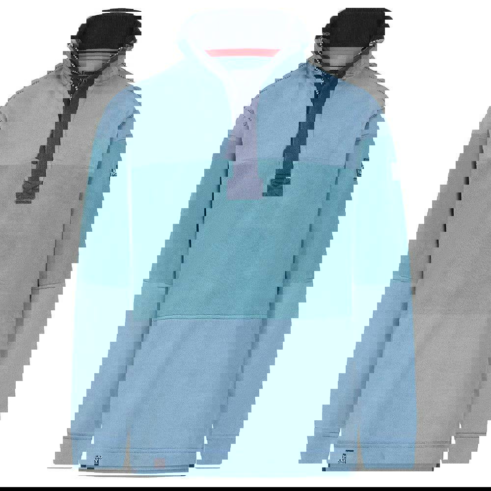 Lazy Jacks men’s pique sweatshirt in Peacock, made from 100% cotton with a pre-washed finish. The long-sleeved design is cut to a relaxed fit and fastens with a quarter zip for easy pull-on wear. A standing collar adds structure, while printed detailing and an embroidered logo complete the look.