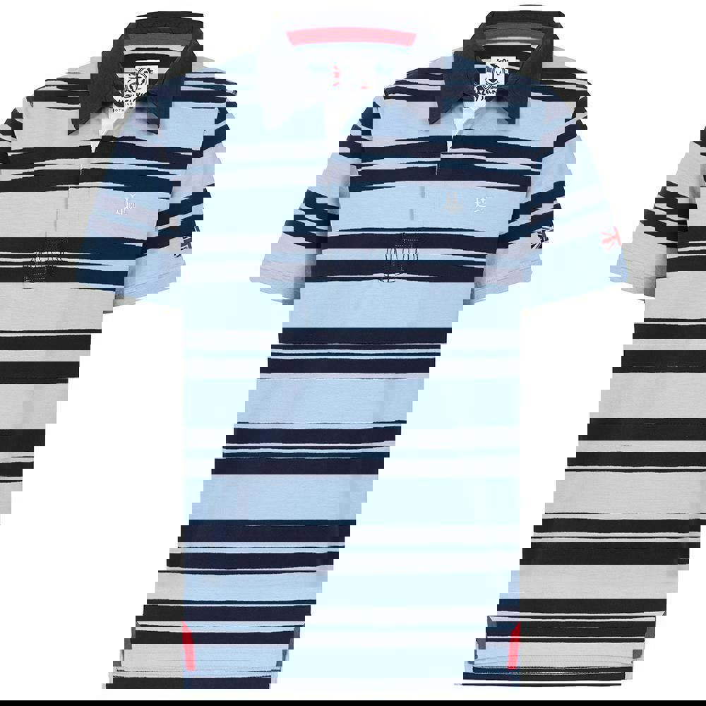 This men’s rugby polo shirt comes in sky with stripe detailing and an embroidered logo for a clean, sporty look. Made from 100% cotton with a textured finish, it offers a soft handle and a lightweight, breathable feel.