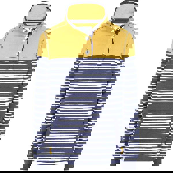 It fastens as a pull over style with a quarter zip and a 3 button placket. The design includes an embroidered logo and printed detailing, with two side pockets for practical storage. The fabric is described as breathable, durable and soft.