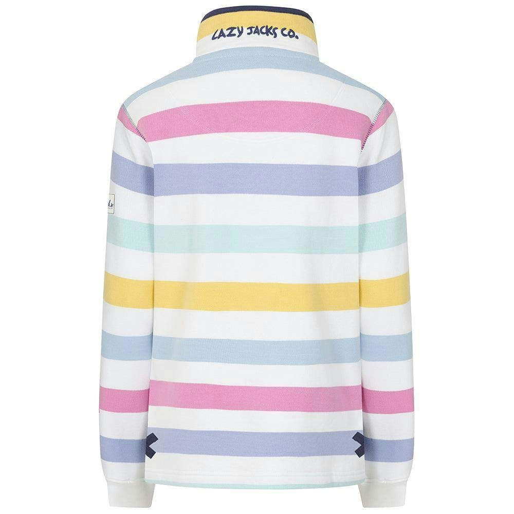 Lazy Jacks women’s button neck sweatshirt in multicoloured printed cotton with a pre-washed finish. The relaxed fit and long sleeves suit everyday wear, while the standing collar adds a clean, structured neckline. A three-button placket and pull-over style keep the front simple and practical, with two side pockets for small essentials.