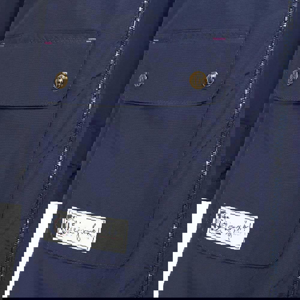 The hood is sew-on and includes an adjustable drawstring. Two side pockets provide practical storage, each finished with a flap closure and stud fastening.