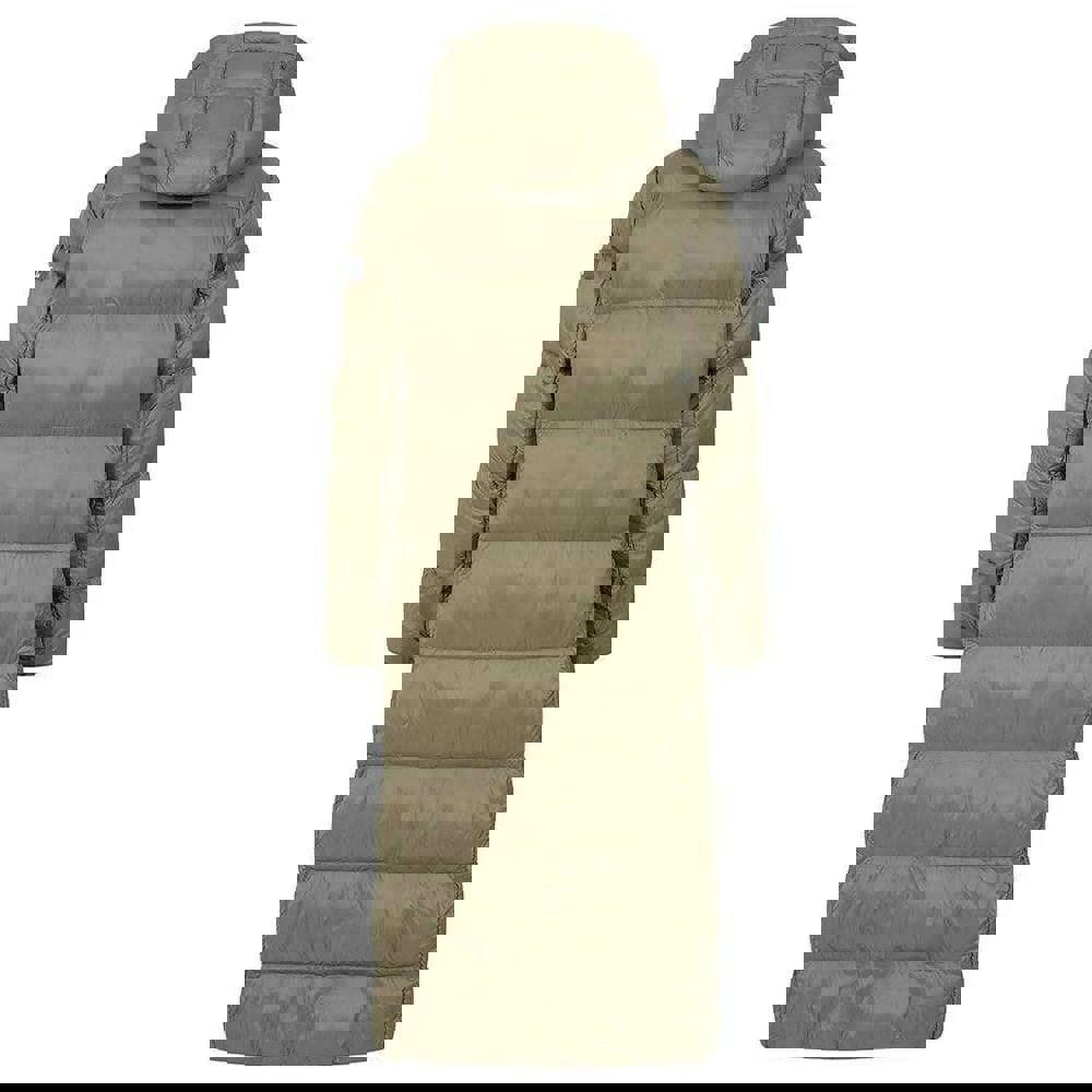 This women’s long puffer jacket is made from 100% nylon and finished in a plain khaki colour with a logo detail. The quilted construction and longline fit create a streamlined outer layer for everyday wear.