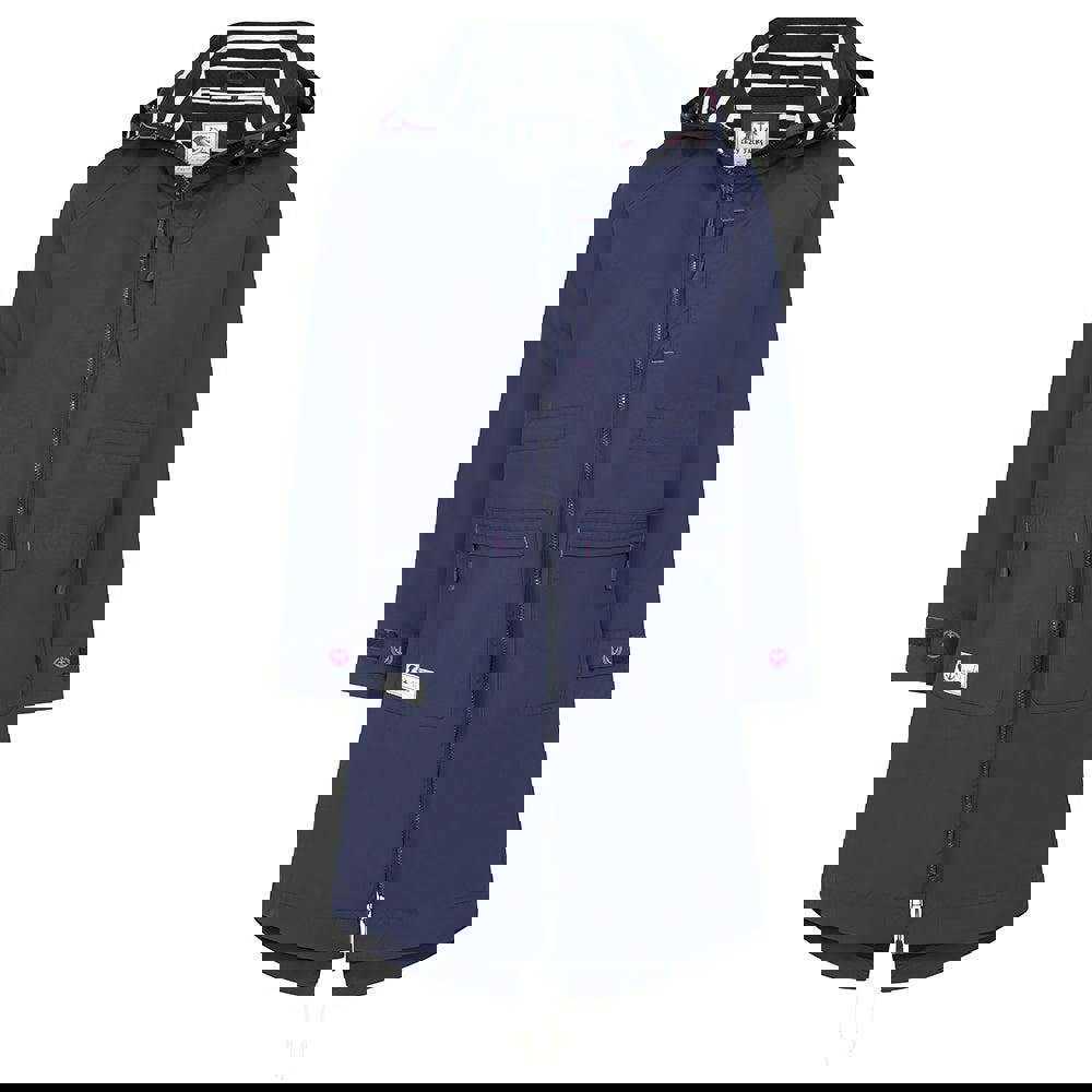 Lazy Jacks women’s long waterproof jacket in marine, made with a 100% nylon outer and a PU coating. The lining is 100% cotton. The plain design is finished with embroidered detailing and a branded patch. A high-neck, hooded shape and long sleeves create a practical outer layer for wet weather.