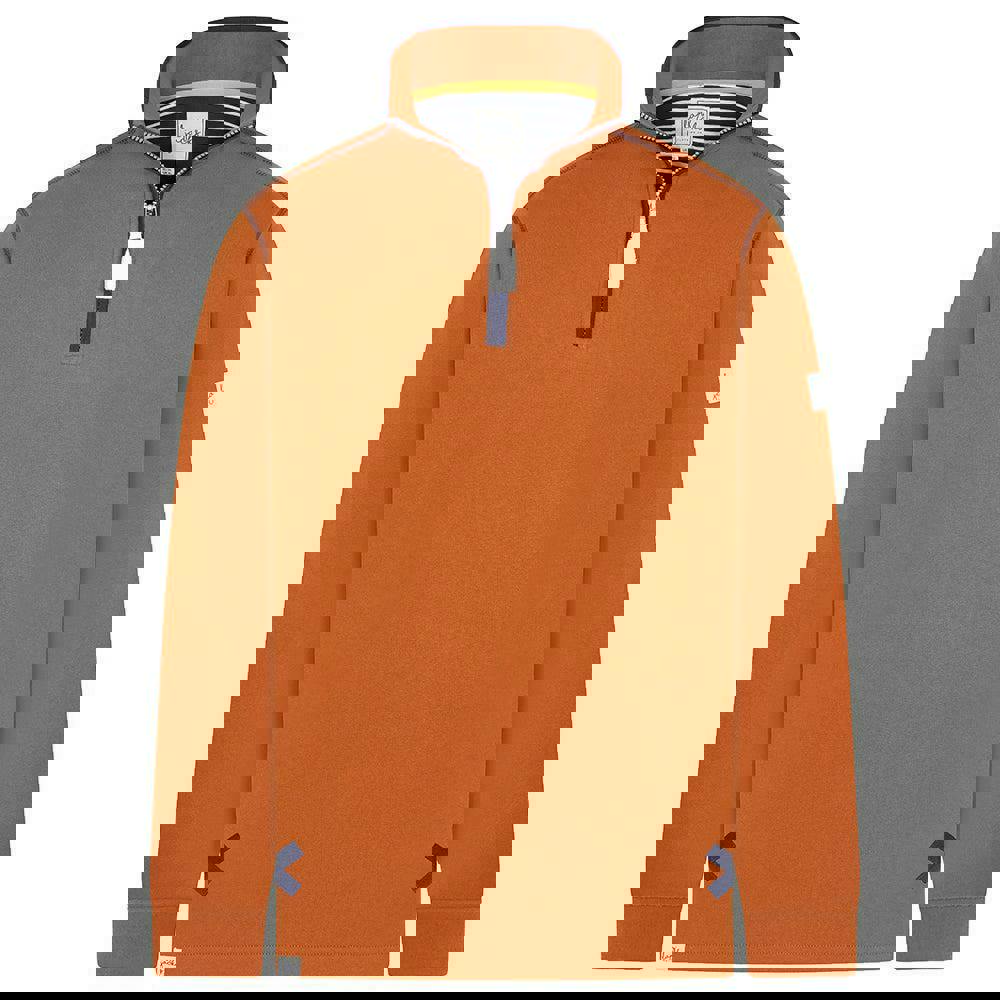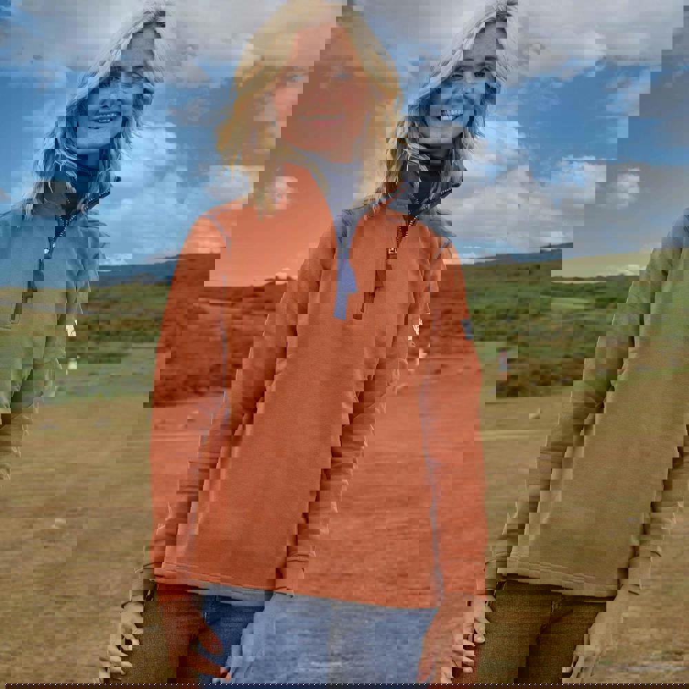 Lazy Jacks women’s quarter zip sweatshirt in orange, made from 100% cotton with a pre-washed finish. The design combines a plain base with logo detailing for a clean, casual look. A fused stand up collar frames the neckline, while long sleeves keep the silhouette classic and easy to wear.