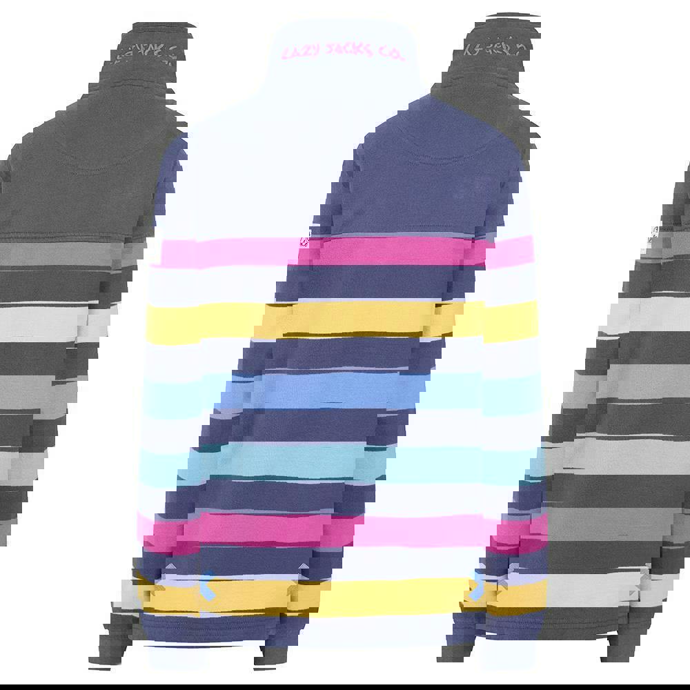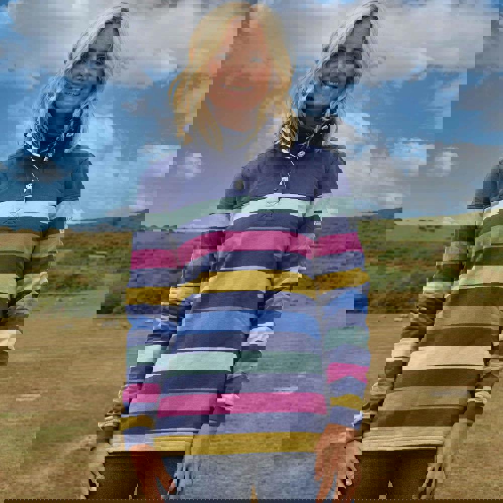 Lazy Jacks women’s striped sweatshirt in multicoloured cotton with a pre-washed finish. The relaxed fit and long sleeves create an easy shape for everyday wear, while the standing collar adds a clean, structured neckline. A 3 button placket and pull-over style keep the front simple and practical.
