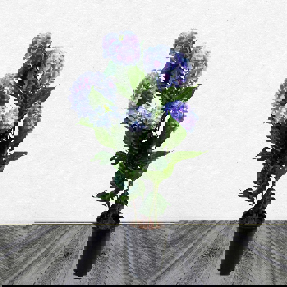 Potted hydrangea with 200 flowers and 51 leaves potted in a black plastic pot .