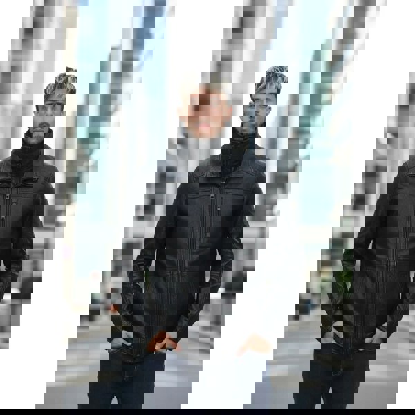 * Layered Double-Collar Design: Outer leather stand collar paired with an inner ribbed/knitted collar for enhanced warmth, comfort, and modern style