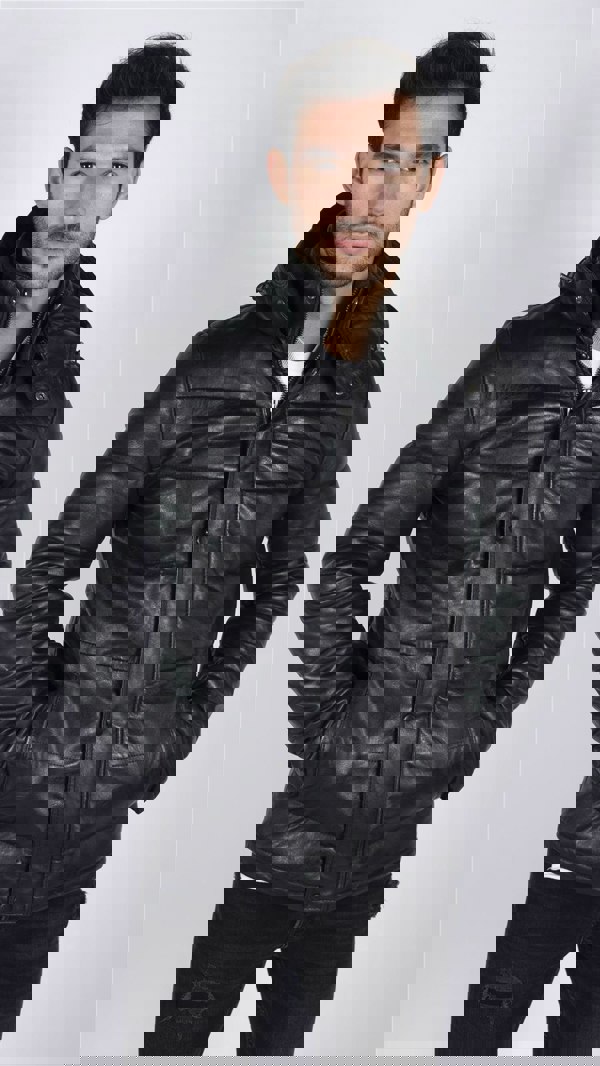 * Mens Retro Real Leather Puffer Hooded Jacket Finished In Jet Black