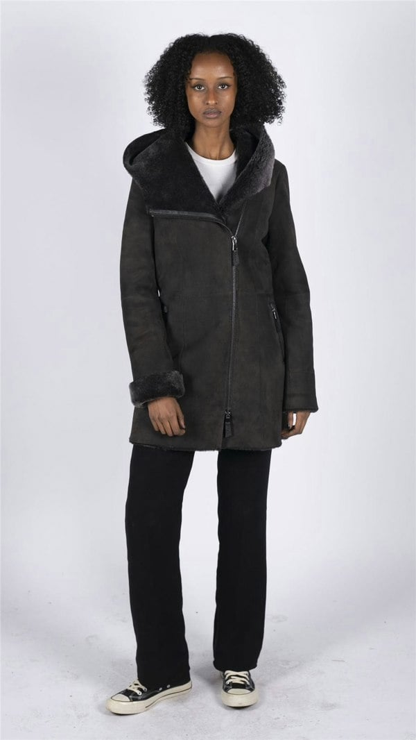* Womens Genuine Sheepskin 3/4 Coat With Zip & Hood
