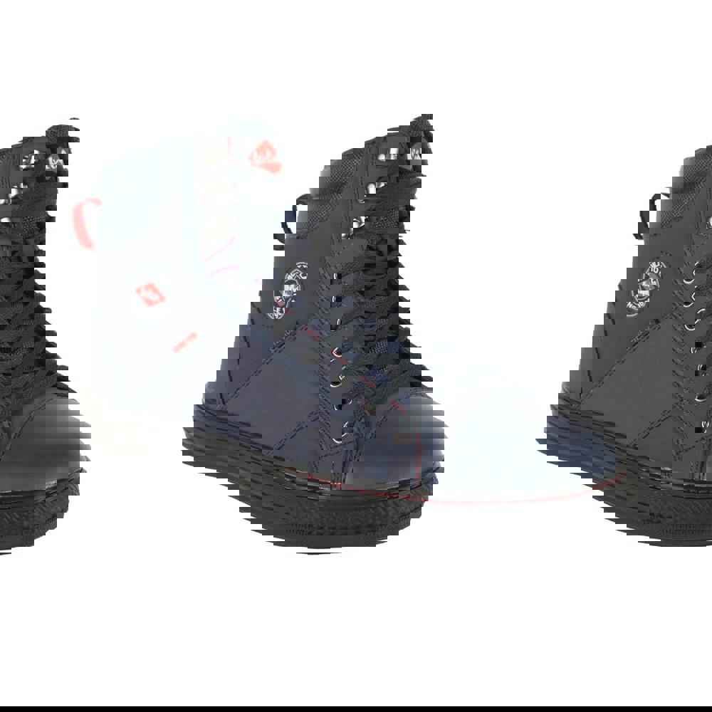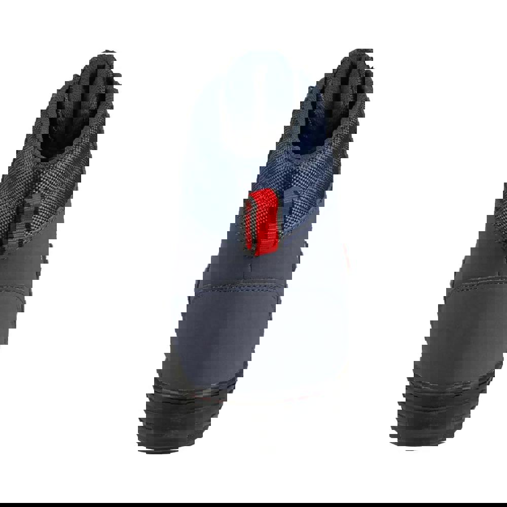 Finished in a plain navy blue design with logo detailing, the boots use a lace-up fastening with slip-in entry and seven eyelets. A steel toe cap provides toe protection rated to 200 joules, while the rubber outsole is specified as slip resistant, oil resistant and acid resistant. The construction includes an energy absorbent heel, plus a moulded shape with a padded ankle and padded collar, completed with a pull tab.