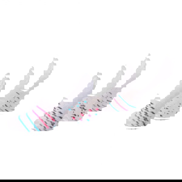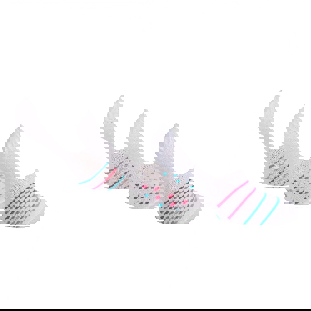 Finished in white, each pair uses contrast colour detailing with a mix of dotted and striped elements, alongside a logo detail for a branded touch.