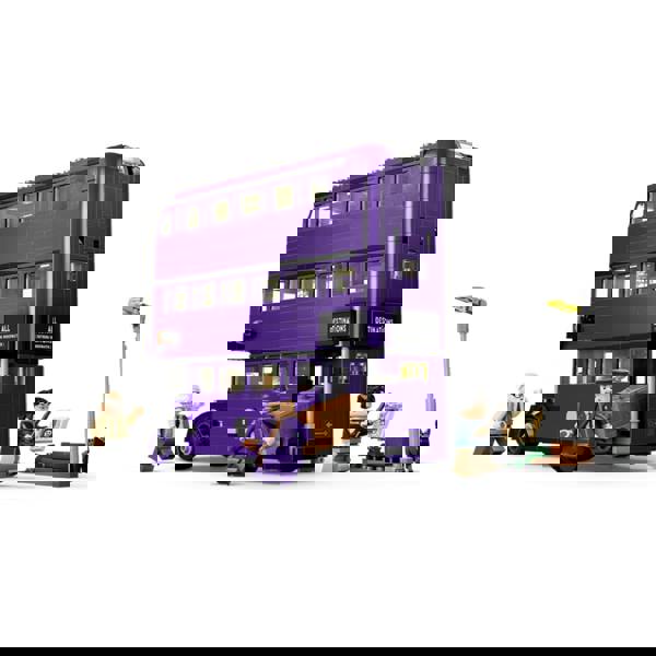 Measuring over 4 inches (11cm) high, 11 inches (29cm) long, and 2 inches (6cm) wide, this collectible model is perfect for LEGO builders and Harry Potter fans of all ages. The exterior of the Knight Bus boasts a sliding door, fold-down arm, and a sign that reads "Knight Bus - Emergency Inter-City Service. " The interior includes seating areas, a shrieking shrub guard, and a bunk bed for the conductor.