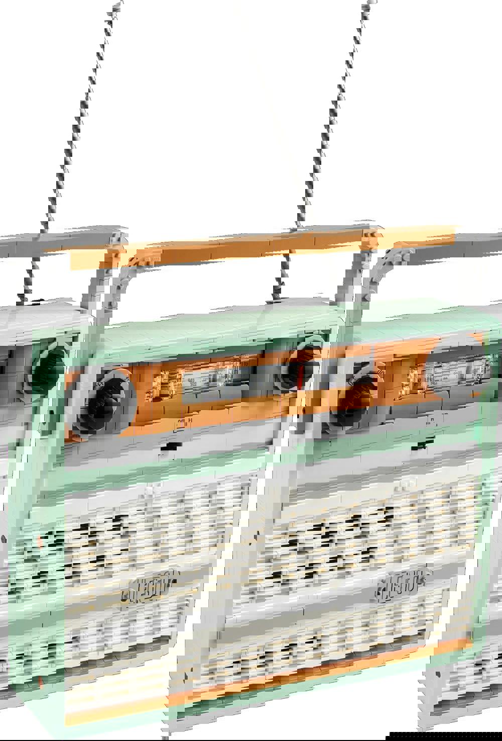 The wooden cabinet of the Retro Portable Radio is constructed from a variety of LEGO elements, giving it a natural, textured finish. The radio's exterior is adorned with intricate patterns and subtle details, making it a true work of art. The model also comes with a detachable antenna, allowing you to fine-tune your radio stations and enhance your listening experience.