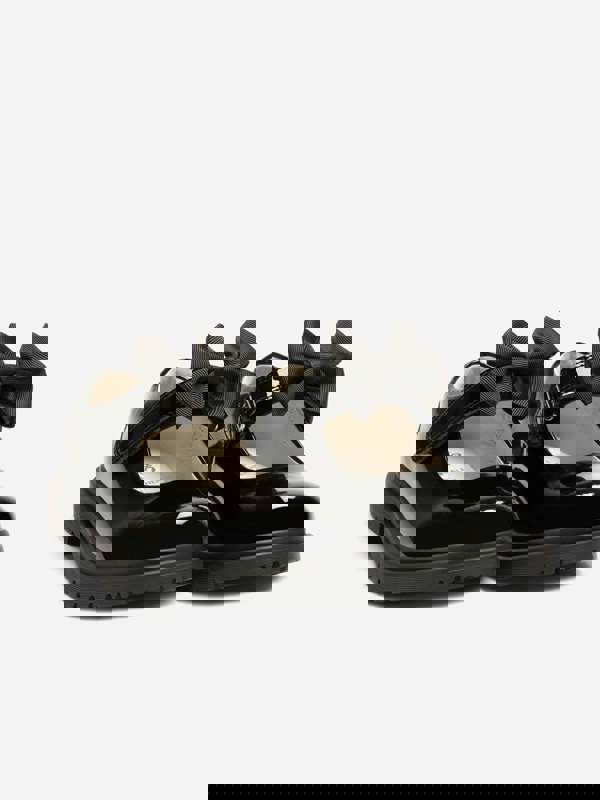 Lelli Kelly Girls Masie Bow Patent School Shoes in black pair a patent leather upper with a detachable black grosgrain bow at the front. A leather lining and leather insole sit inside the slip-on shape, finished with a front self sealing strap for easy fastening. An embroidered LK logo on the side adds a branded detail.