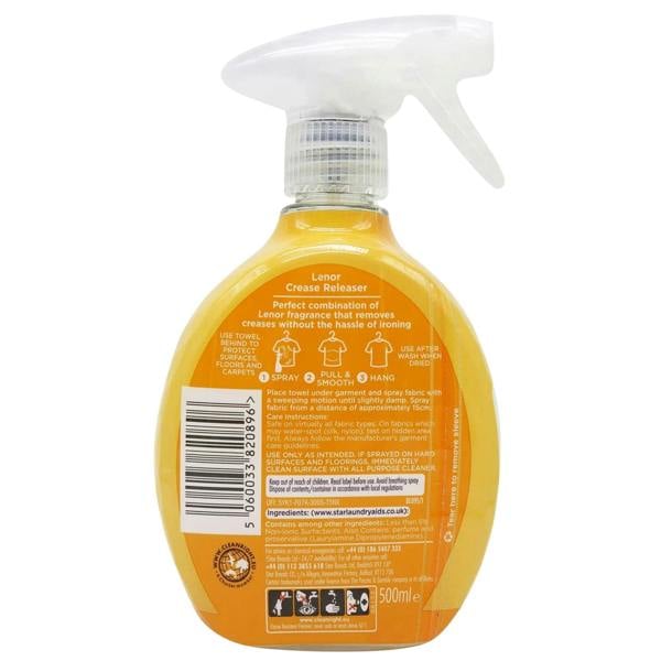Lenor Crease Releaser Spray Summer Breeze helps refresh and smooth fabrics quickly without the need for a hot iron. Formulated by Lenor with a light Summer Breeze fragrance it relaxes fibres and leaves clothes smelling fresh and feeling soft. This easy to use spray enhances everyday garment care and saves time on ironing routines.