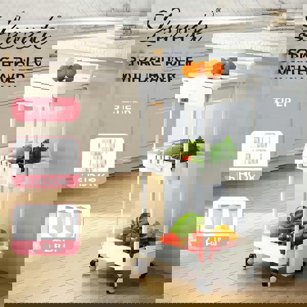 Organise your home and office with the Levede 3-tier trolley a versatile rolling storage cart designed for maximum convenience. This utility cart with wheels comes with a smooth drawer 3 spacious tiers 2 detachable storage bins and 6 hooks offering flexible storage for every need. Whether used as a kitchen trolley bathroom storage cart beauty trolley laundry organiser or office utility cart it keeps essentials neatly stored and within reach.