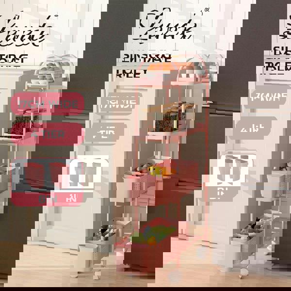The Levede 4-Tier Metal Storage Trolley is a multifunctional storage organizer perfect for kitchen bathroom laundry office and bedroom. Featuring 2 pull-out baskets this rolling utility cart makes it easy to access and organize fruits vegetables toiletries beauty products and office supplies. With its 2 side storage bins you gain extra space for bottles utensils or cleaning items. Made from rust-resistant metal this slim rolling cart is sturdy durable and mobile thanks to smooth-rolling wheels. Its space-saving narrow design fits easily into tight spaces making it an ideal storage solution for modern homes.