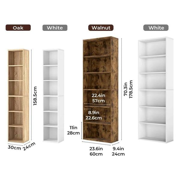 This tall slim bookshelf features 6 open shelves giving you plenty of space to organise books CDs DVDs comics plants or display your favourite ornaments. With its modern wood shelving design and compact footprint it is ideal for the living room bedroom study or home office. Perfect for creating a tidy clutter-free space while adding a touch of contemporary style.