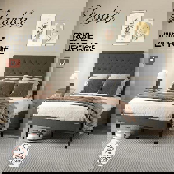 Levede Upholstered Bed Frame delivers a modern elegant and supportive sleep solution for UK homes. Designed with a sturdy MDF and plywood structure high-density 18D foam and soft linen fabric this bed frame brings comfort durability and contemporary style to any bedroom. The tufted headboard offers excellent back support for reading or relaxing while the raised legs provide easy access for robot vacuums. Our double bed frame is perfect for modern apartments guest rooms and master bedrooms.